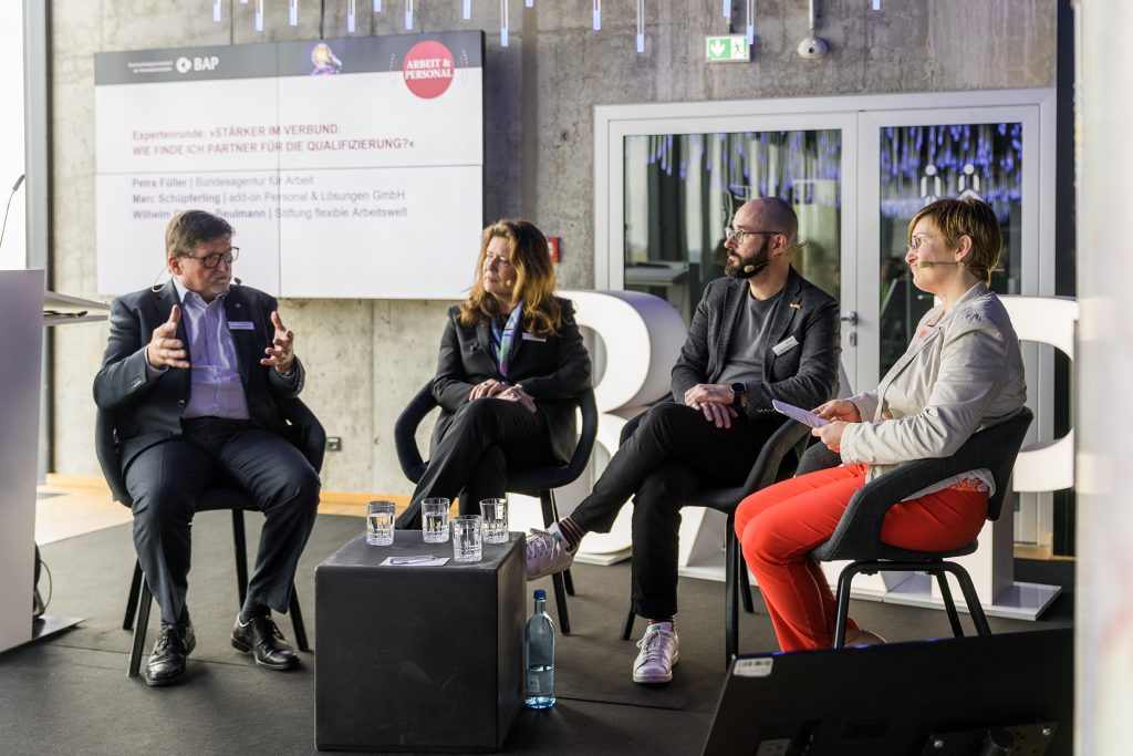 In der anschließenden Talkrunde mit Marc Schüpferling, Petra Füller und Wilhelm Oberste-Beulmann wurde das Thema der Personalentwicklung durch Weiterbildung und Qualifizierung unter der Moderation von Ines Dauth diskutiert. Dazu stellte Marc Schüpferling, Leiter Unternehmensentwicklung und Mitglied der Geschäftsführung bei add-on Personal & Lösungen, zunächst den „Qualifizierungsverbund Nürnberg“ vor, der 2022 in Zusammenarbeit der Agentur für Arbeit Nürnberg, add-on Personal & Lösungen sowie der Stiftung flexible Arbeitswelt gegründet wurde. Dieser liefert ein positives Beispiel dafür, wie Qualifizierung und Weiterbildung durch die Kooperation von Personaldienstleistenden, Bildungsträgern und unterstützenden Institutionen effektiv gelingen können. Petra Füller, Leiterin der Koordinierenden Stelle Zeitarbeit bei der Bundesagentur für Arbeit (BA), erläuterte dazu die koordinierende Funktion der und Möglichkeiten der Förderungen durch die BA. Vorstandsvorsitzender der Stiftung flexible Arbeitswelt, Wilhelm Oberste-Beulmann, zeigte zudem die wichtige Funktion der Stiftung als Unterstützerin dieses Verbunds auf: nicht nur finanziell, sondern insbesondere auch als ideelle Mittlerin, um weitere Kontakte zu knüpfen und Kooperationspartnerinnen und -partner wie IHKs und lokale Handwerkskammern zu gewinnen. Deutlich wurde, dass die Teilnehmenden der Talkrunde Qualifizierung als bedeutenden Faktor der Personalentwicklung verstehen, da sie verdeckte Potenziale der Beschäftigten offenbaren und die gezielte Weiterentwicklung zu Fachkräften ermöglichen könne.