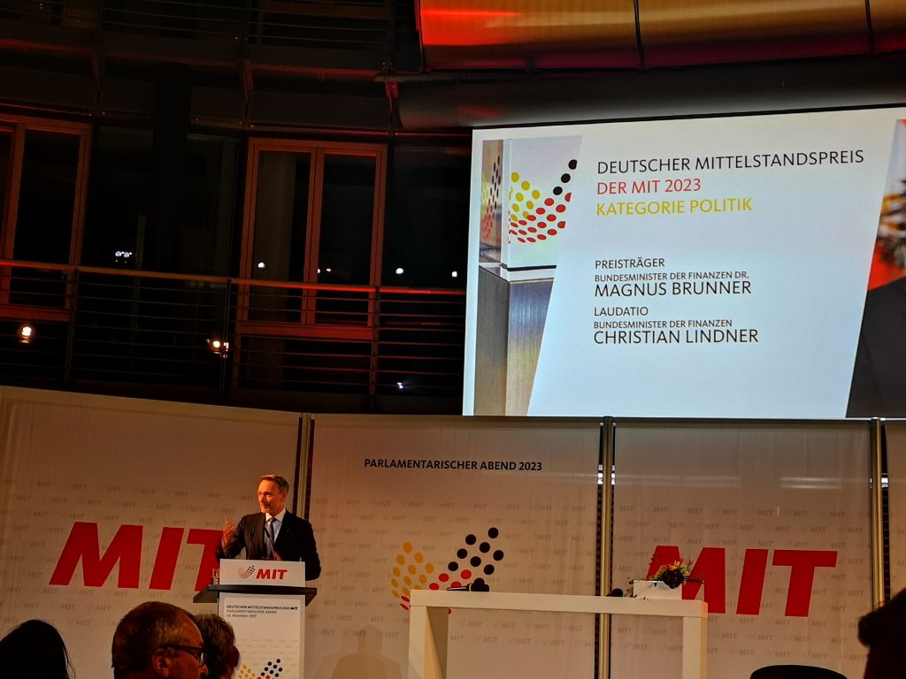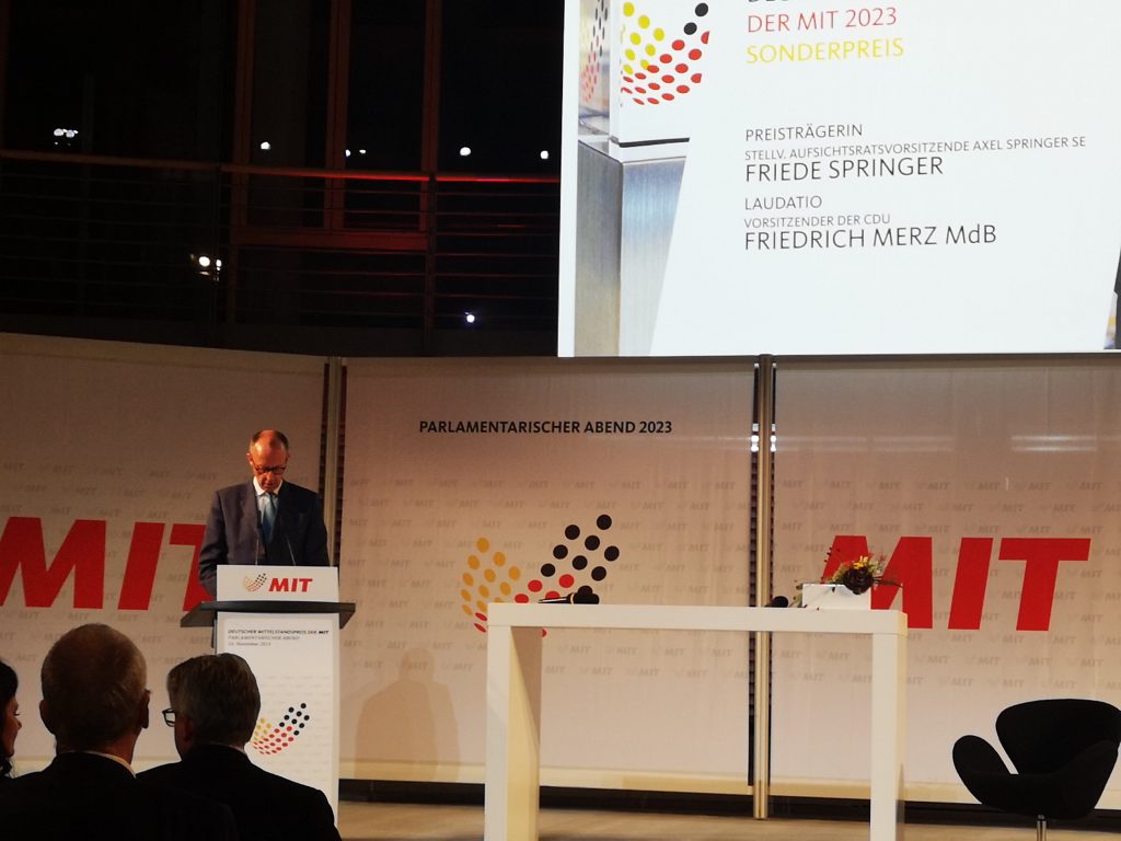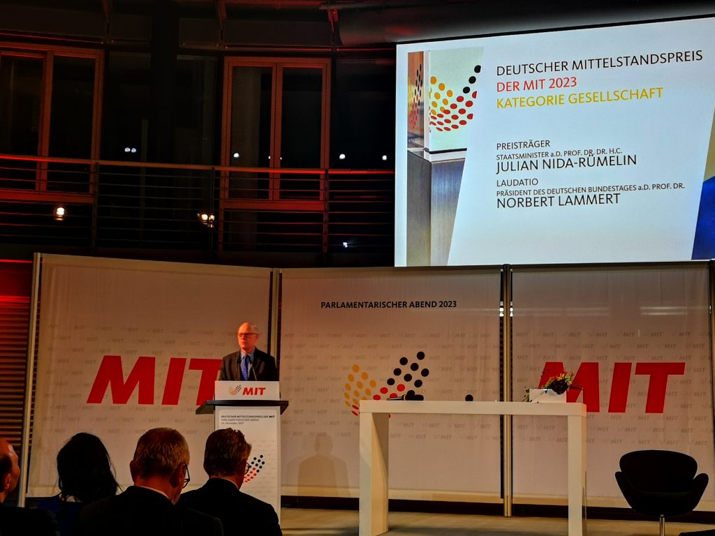 Eröffnet wurde der Parlamentarische Abend von der MIT-Bundesvorsitzenden Gitta Connemann MdB. Danach wurden die Preise in den verschiedenen Kategorien sowie ein Sonderpreis verliehen. Letzterer ging an Friede Springer, stellvertretende Aufsichtsratsvorsitzende der Axel Springer SE. Der Preis in der Kategorie „Politik” ging an den österreichischen Bundesminister für Finanzen, Dr. Magnus Brunner. Einen weiteren Preis erhielt Prof. Dr. Dr. h.c. Julian Nida-Rümelin, Staatsminister a.D.. Er bekam den Preis in der Kategorie „Gesellschaft”. Der letzte Preis in der Kategorie „Unternehmen“ ging an die SONOTEC GmbH.